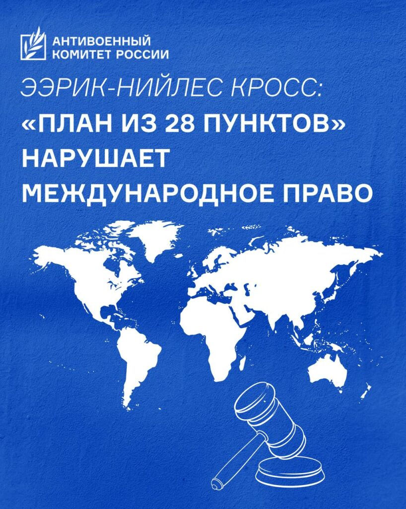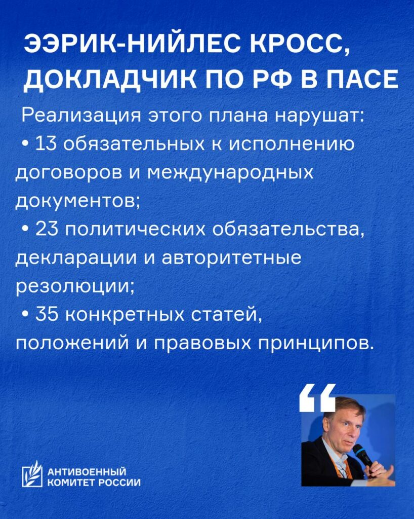 Ээрик-Нийлес Кросс, докладчик по РФ в ПАСЕ, проанализировал предложенный «план из 28 пунктов» о возможных условиях перемирия. По его подсчётам, реализация этого плана потребовала бы от США нарушения 71 международно-правового и политического обязательства, включая документы ООН, ОБСЕ, ПАСЕ и принципы непризнания территориальных захватов силой.
